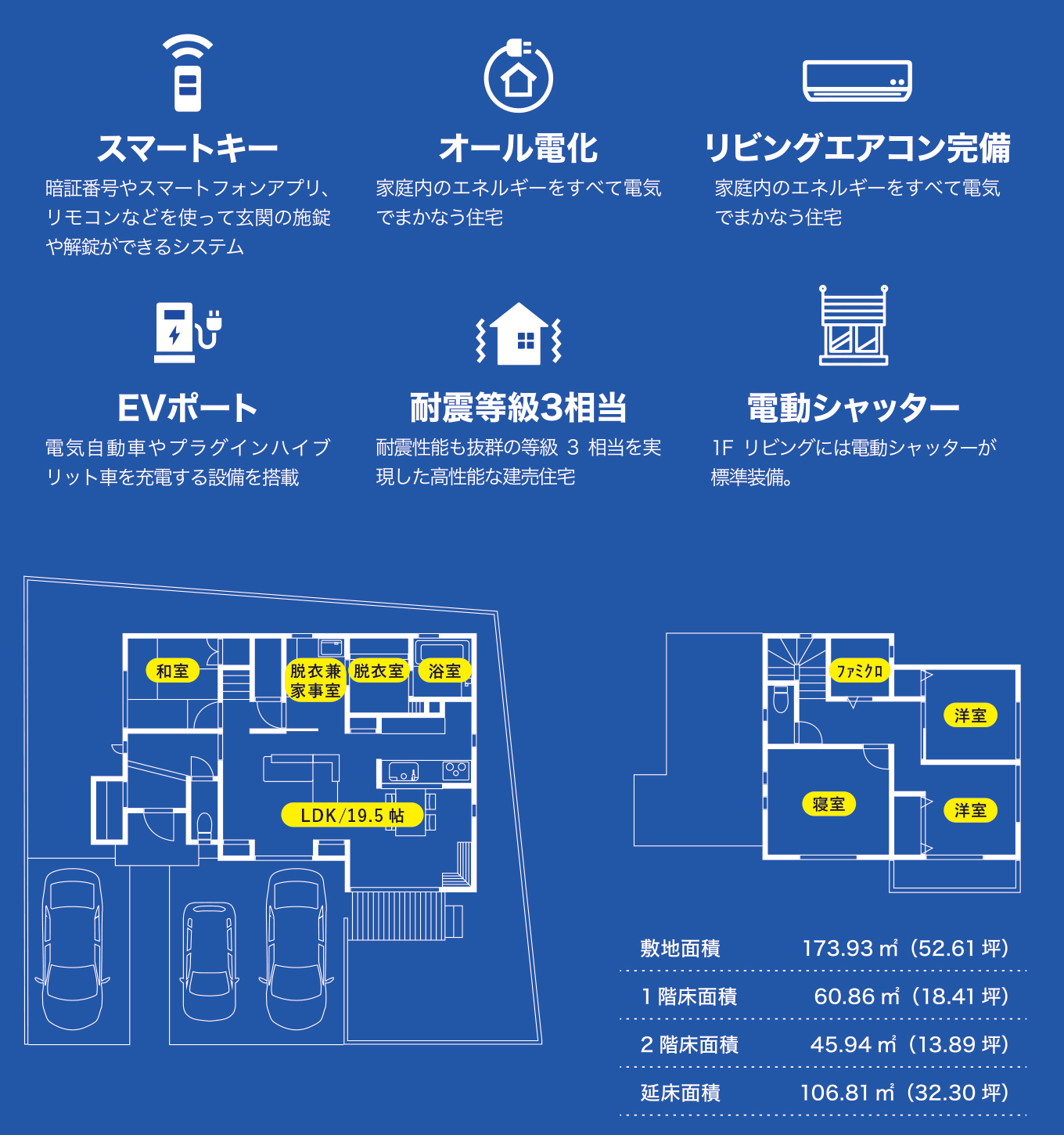 ミライズタウン郷津 1号地 M-03 【敷地面積】173.93㎡(52.61坪) 【1階/2階 床面積】60.86㎡(18.41坪) / 45.94㎡(13.89坪) 【延べ床面積】106.81㎡(32.30坪) 現地ご覧いただけます! まずはお気軽にお問合せください。